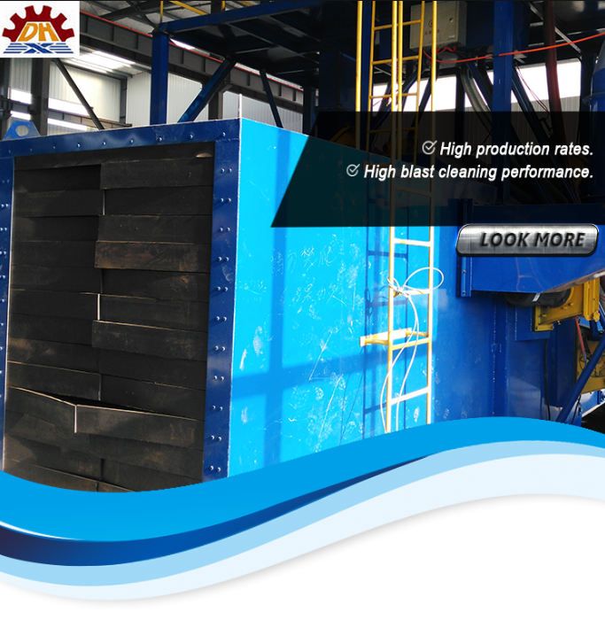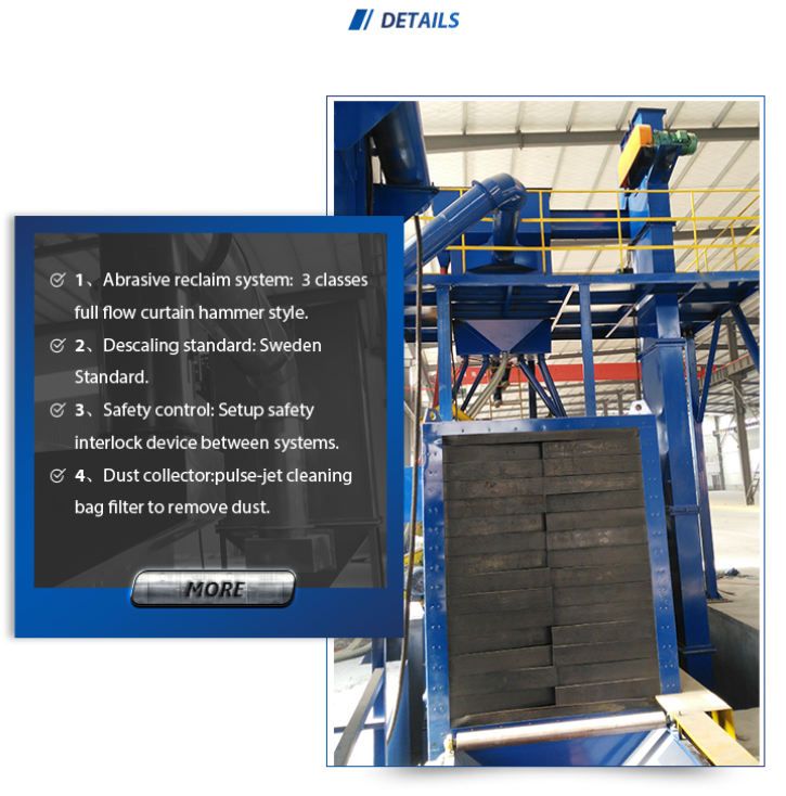 Equipment: rollers conveyor, blasting chamber, blast wheel, abrasive recycle system, separator , cleaning chamber, dust collector, PLC control system etc.