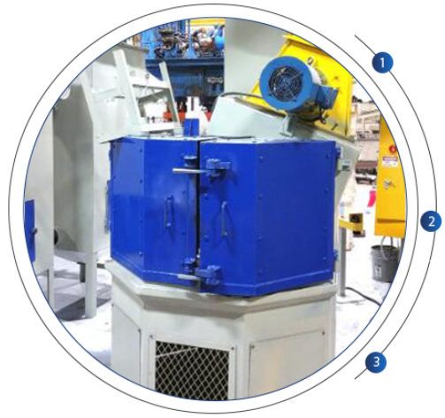 ●Within the abrasive recycling system, a large highly efficient air wash separator prolongs shot life and a drop-out box removes coarse particles to avoid destruction of filter elements.
